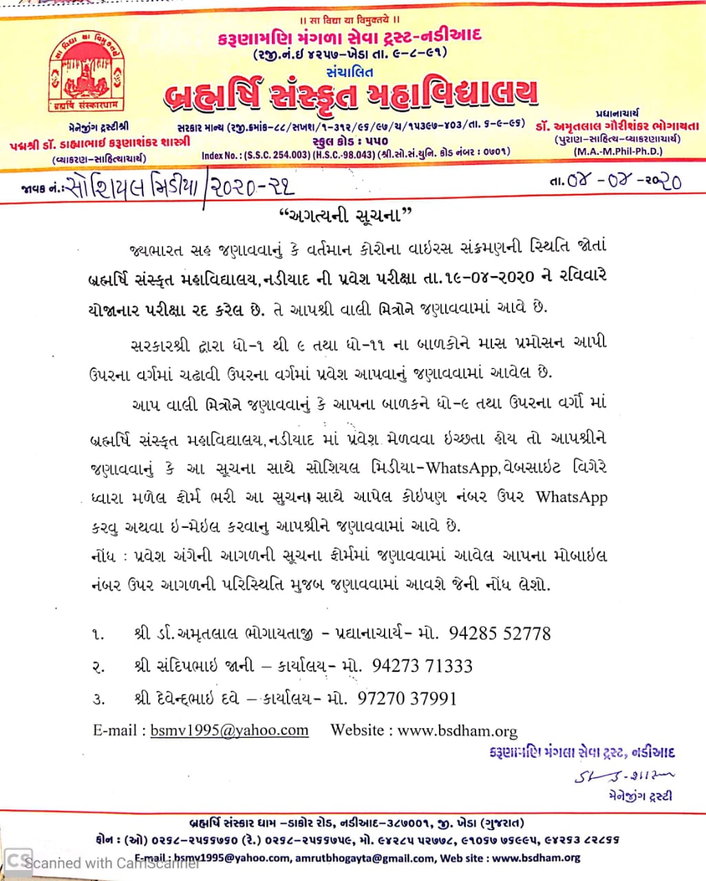 Within two years of establishment of Brahmarishi Sanskar Dham his tireless efforts has started working for Sanskrit University Veda Vidhya Bhavan, Cow care centre,English study centre, Yoga Kendra, Library, Hostel, ; ect......